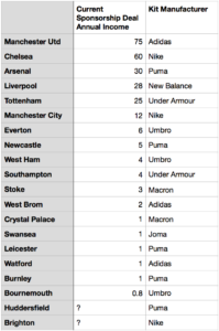 Sponsorship revenue is a major source of income for premier league clubs and has been increasing year on year. Commercially vital to clubs, major sponsorships provide revenue of a long period due to the contracts usually being over a few years. This year club sponsorships brought in £282 million in revenue for premier league clubs before taking into the various partnerships they also delve into. This article will will go into detail about the types of industries that are attracted to invest and sponsor football clubs. We will also look at kit manufacturers and the role they play in football finance.