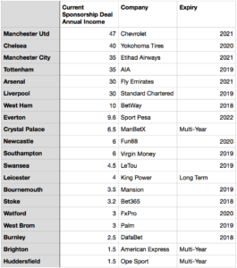 Interestingly, all London clubs are in the top half of the table, suggesting their is a preference among sponsors to pay a premium to sponsor London clubs, with Crystal Palace above the likes of Newcastle, Leicester, West Brom and Southampton.