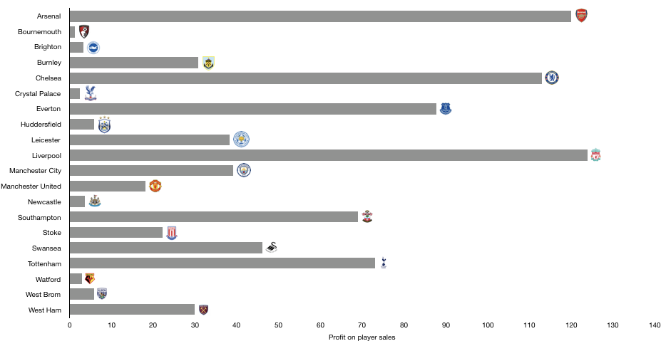 profit on player sales of £120m, due to a flurry of sales including Oxlade-Chamberlain,