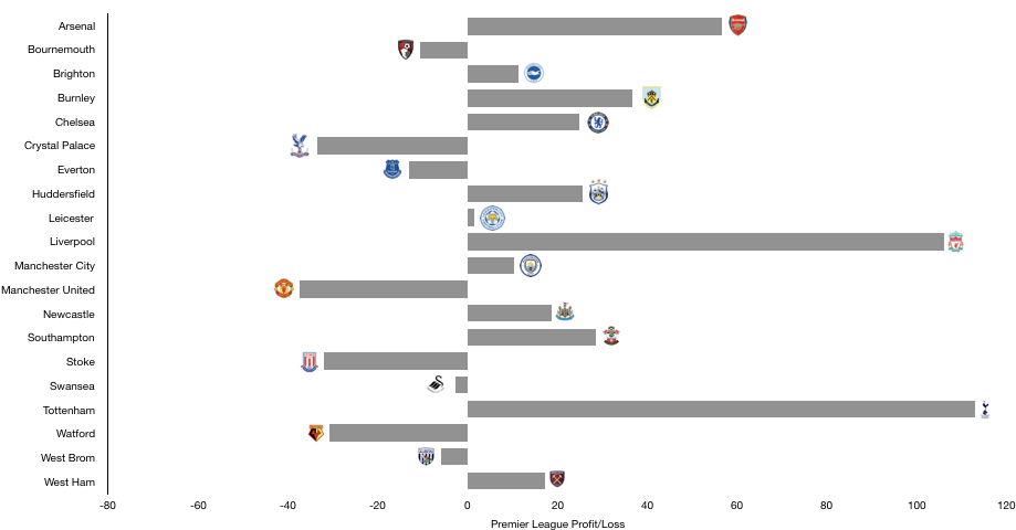 variances among teams, from a record breaking £113m profit (Tottenham) to a