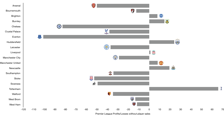 Everton (£88m) and Tottenham (£73m) after the high-profile sales of Coutinho,